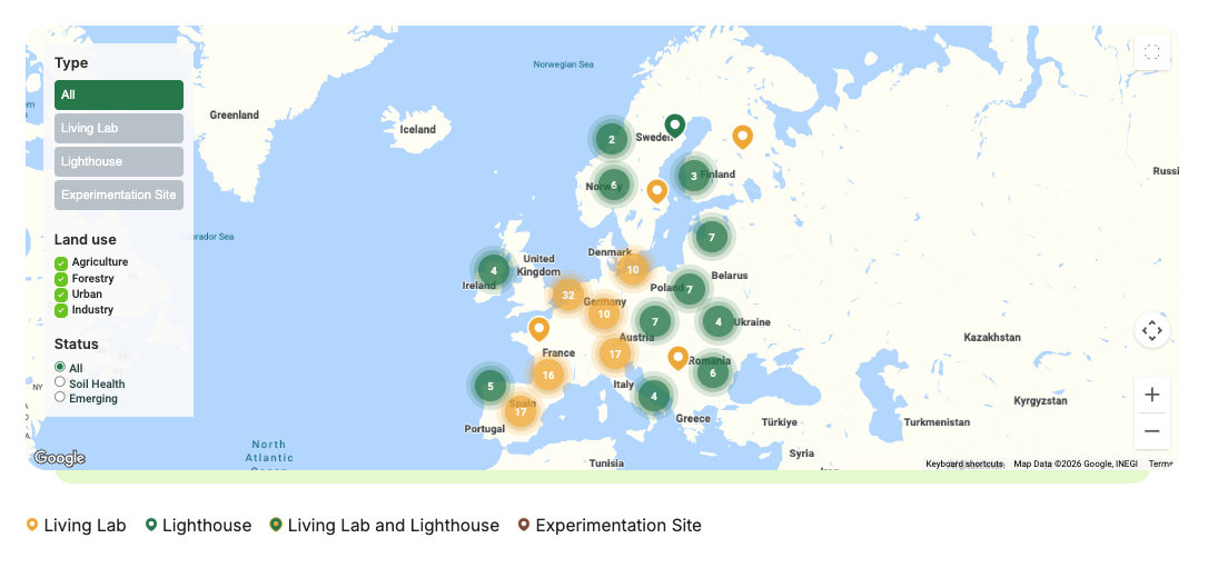 The Atlas is an interactive map showing all Mission Soil Living Labs, Lighthouses, and Experimental Sites currently operating across Europe. It provides a structured overview of active initiatives by location, type, and context.